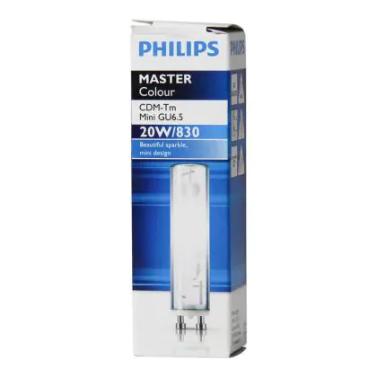 The Philips CDM-Tm Mini 20W 830 GU6.5 lamps emit a warm white light (3000K) to allow you to create an appealing ambience. The colour rendering index is also excellent, more than 80-89Ra.